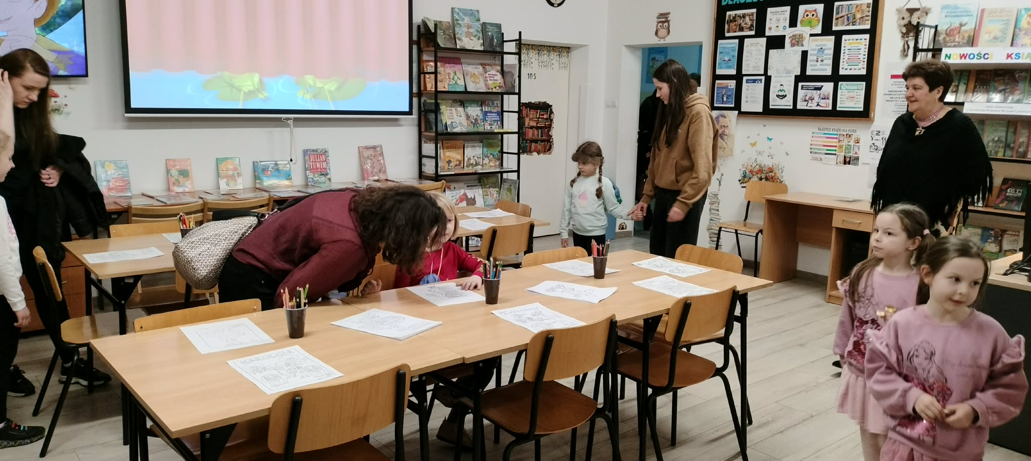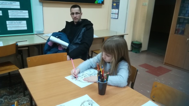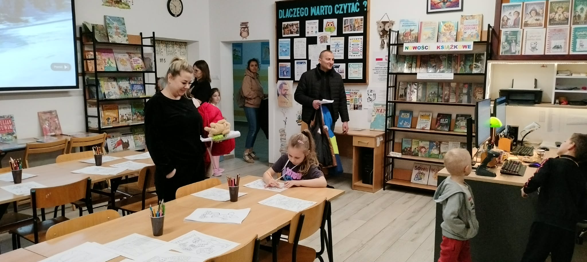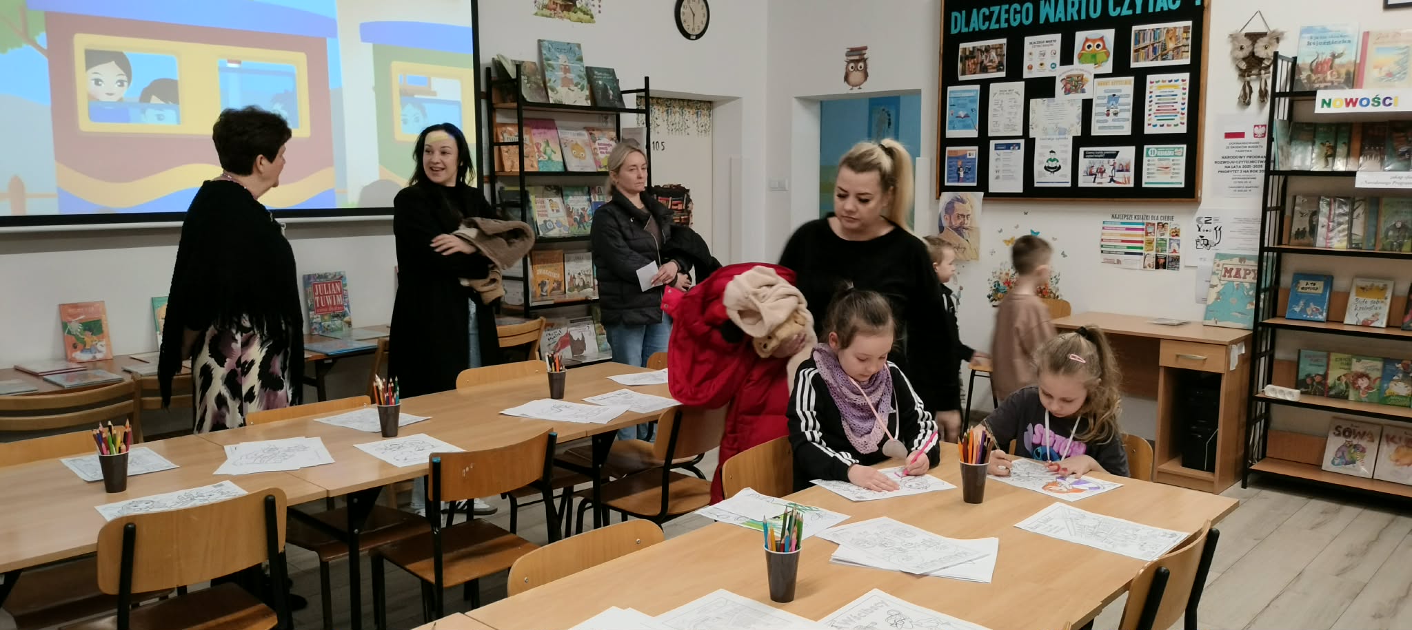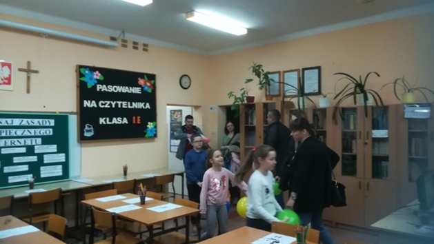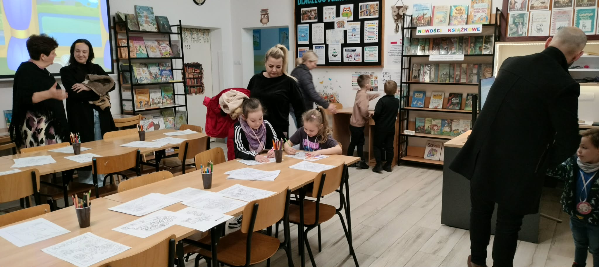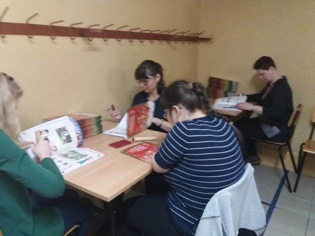 rodzice przebywający na terenie szkoły czytają książki,(każdy
